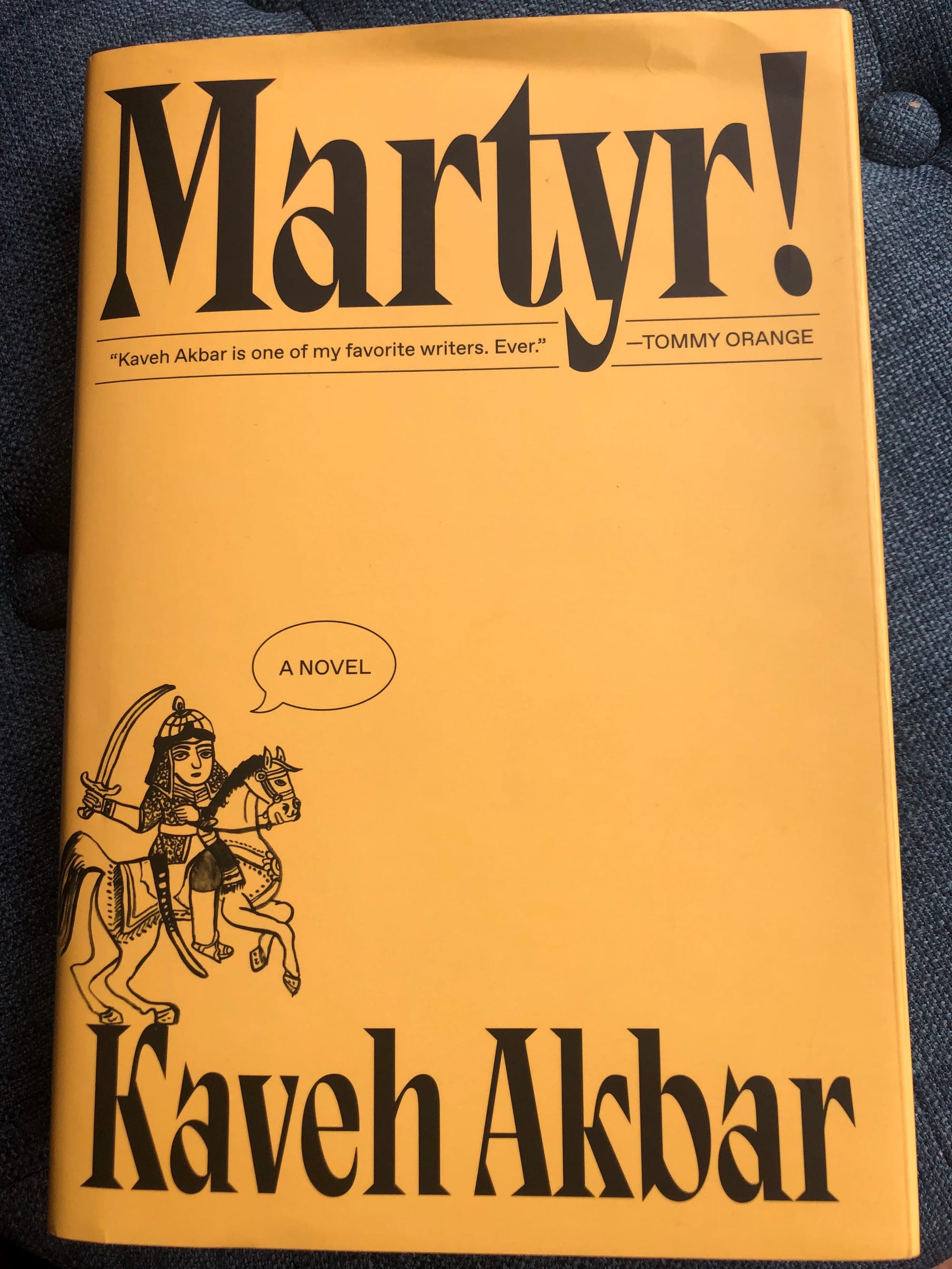 What I'm reading right now: Martyr! by Kaveh Akbar. Cyrus Shams has been through it, let's just say, and he's doing his level best to come to terms with the meaning of life – and death. I am almost done with this book, and would love for someone else to read it too so I can talk to them about the magic on these pages. Amazing writing, imaginative storytelling, an imperfect hero. I'm here for it, and think you should be too.