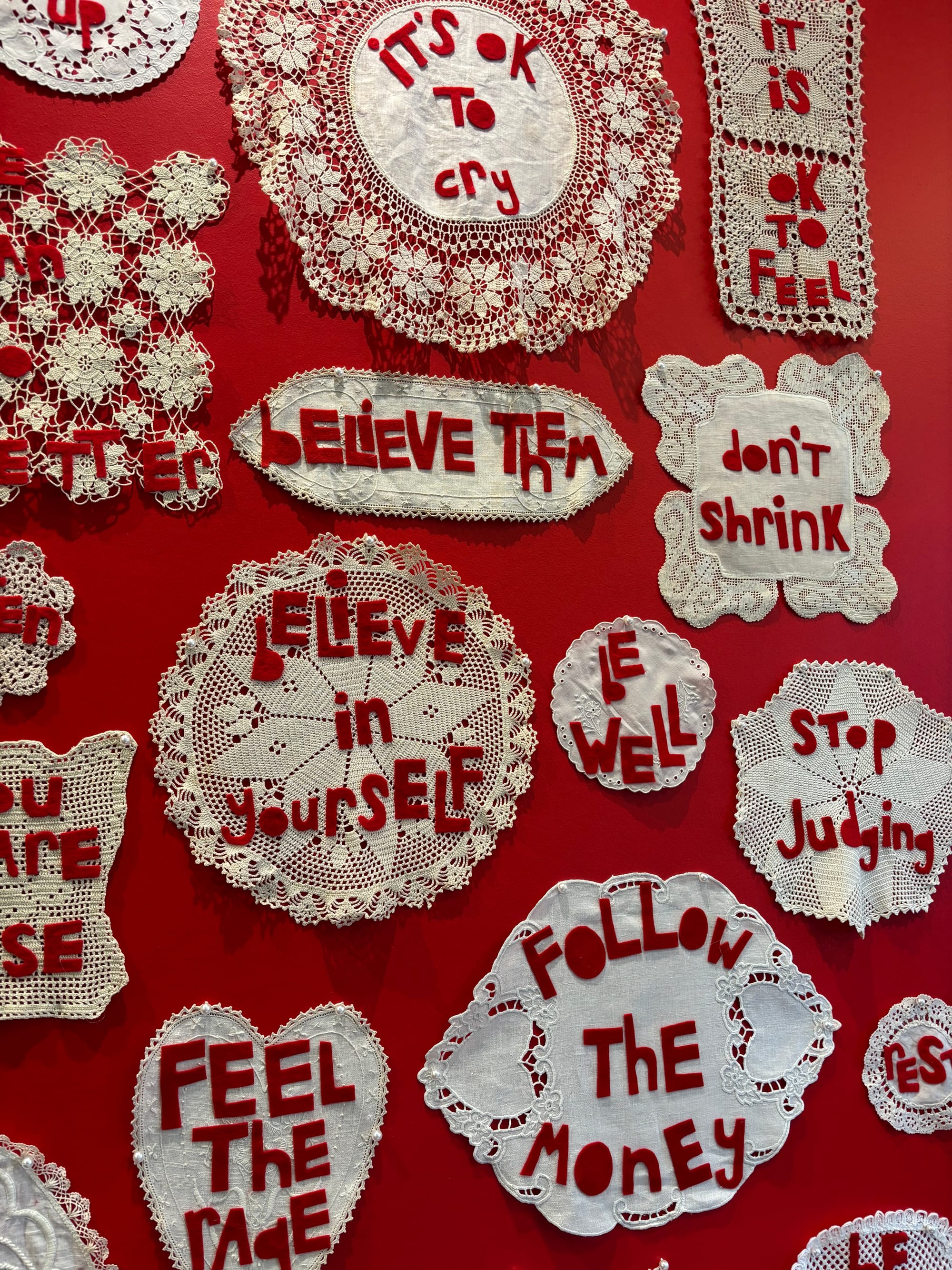 Last Thursday afternoon, I went museum-hopping while I waited for my youngster to be done with class for the week. I mentioned the international poster biennial exhibit I saw at MODA in the last issue, but I also wanted to mention a smaller exhibit there too – Carole Loeffler's Granny Graffiti. For the past eight years, this Philadelphia-based artist has cut out various affirmations from red felt and glued them onto frilly doilies before hanging them on telephone poles. People really like the cozy-looking messages that do everything from inspire to light a fire under their rears. Loeffler work tends to appear when she feels people need it most...like right now. If you're in the Atlanta area – or have plans to be – be sure to pop by MODA to see this and the poster biennial exhibit, both on display until mid-May.