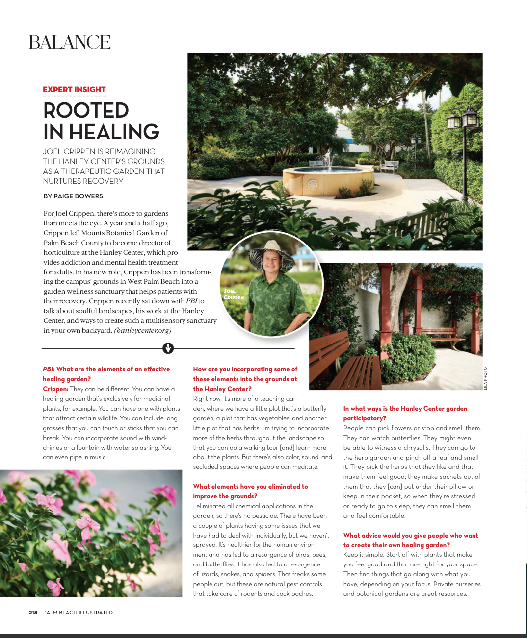 I recently spoke with horticulturalist Joel Crippen about how he's transforming the grounds of a South Florida addiction and mental health facility into a lush sanctuary for wellness and recovery. What I loved about this conversation: Crippen also provided actionable tips for creating your own healing garden at home. The key is to keep it simple, starting with plants you love, and then going from there with elements that will delight all five of your senses. Think trickling fountains, butterfly-attracting flora, and aromatic herbs such as lavender and basil. Whatever it is, rest assured that you can plant your own little corner of Zen.