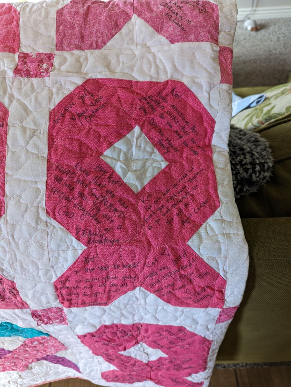 This past weekend was my sister’s birthday. A lovely group of women in her neighborhood brought her some vegan cupcakes and gave her a beautiful quilt that they made. It was an incredibly moving gesture, one, because they knocked this gorgeous quilt out in just a few weeks, and two, because they got other neighbors to write their messages of love and support on it.