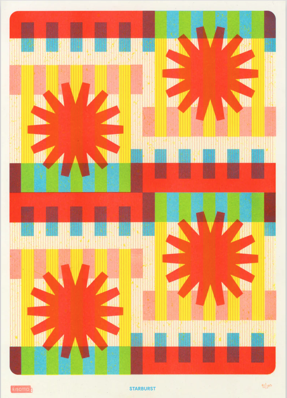 Longtime readers of this newsletter know that I tend to frolic in various creative pursuits from time to time. Take bookbinding, for example. I thought it would be interesting to learn how to make the objects in which stories are printed (or secrets are scribbled), even though that sort of thing is done by machines these days. And you know what? Bookbinding is absolutely satisfying, I've discovered. In the process of learning about it, and zine-making, and so forth, I've become interested in risograph printing, an example of which you can see above. What is risograph printing, you ask? Created in Japan in the 1980s, it is done on machines that look like photocopiers, but work like screenprinters. You can make something geometric like the image above, or you can fiddle with photographs if you like. In the end, you get a brightly colored print with a quirky handmade aesthetic. "Physical things land differently," says Gabriella Marcella of Risotto Studio in Glasgow, Scotland. "A postcard through the door has a weight, texture and intimacy that digital communication doesn’t." Of course, I want to take a risograph class sometime soon. I know I'm not alone in that. After all, The Guardian did a recent piece about the charm of this style of printing, its global following, and the major exhibit of it taking place in the U.K. The story is centered on Marcella and her work with Risotto, which includes shipping super-cool artist prints to subscribers each month.